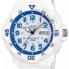 Model ten posiada okrągłą, białą kopertę wykonaną z lekkiego i wytrzymałego tworzywa żywicznego, co sprawia, że zegarek jest niemal niewyczuwalny na nadgarstku. Biała tarcza ma stylowy akcent – niebieskie akcenty, które dodają lekkości i sportowego stylu. Na tarczy widnieją wyraźne cyfry arabskie, które kontrastują z jasnym tłem, zapewniając łatwość odczytu godziny. Obracający się bezel to narzędzie, które daje pełną kontrolę nad czasem, a funkcja wyświetlania dnia i daty to niezbędny dodatek, by być zawsze na czasie. Waga to zaledwie 39g!