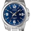 Model CASIO MTP-1314D-2AVEF to klasyczny męski zegarek wyróżniający się stylową granatową tarczą z delikatnym pionowym wzorem, który dodaje głębi i wyjątkowego charakteru. Duże białe cyfry arabskie na godzinach 12, 3, 6 i 9 w połączeniu z wyrazistymi indeksami i smukłymi srebrnymi wskazówkami zapewniają znakomitą czytelność w każdych warunkach. Subtelny pomarańczowy sekundnik ożywia całość, a datownik umieszczony przy trzeciej godzinie zwiększa funkcjonalność bez zaburzenia harmonii projektu. Zegarek został osadzony w solidnej stalowej kopercie z dopasowaną bransoletą o satynowym wykończeniu, co nadaje mu uniwersalnego charakteru – pasuje zarówno do eleganckiej koszuli, jak i do codziennego outfitu. Wodoodporność do 50M czyni go odpornym na zachlapania i krótkotrwałe zanurzenia. Casio MTP – propozycja dla mężczyzny, który szuka stylu, funkcji i trwałości w jednym.