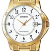 Męski model z kolekcji CASIO, wyróżniający się klasyczną 40-milimetrową kopertą oraz bransoletą ze stali nierdzewnej, pokrytymi trwałą powłoką jonową w kolorze złota. Jasna tarcza z wyraźnymi, czarnymi cyframi arabskimi zapewnia doskonałą czytelność, a dodatkowa skala minutowa w wewnętrznym pierścieniu ułatwia orientację w czasie. Praktyczny datownik zlokalizowany przy godzinie 3 umożliwia szybki wgląd w aktualny dzień miesiąca. Wodoodporność na poziomie WR (Water Resist) sprawia, że zegarek bez obaw można nosić na co dzień – np. podczas mycia rąk czy w deszczową pogodę. Zegarek napędzany jest precyzyjnym mechanizmem kwarcowym, gwarantującym niezawodne działanie.