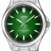 Wykorzystaj moc słońca z analogowym zegarkiem CASIO Solar! Dzięki zasilaniu solarnemu nie musisz martwić się o baterie – panel słoneczny ładuje zegarek światłem, zapewniając mu nawet 4 miesiące pracy po pełnym naładowaniu. W zależności od kąta padania światła, szmaragdowo-zielony odcień tarczy delikatnie się zmieniać – od głębokiej, ciemnej zieleni po jaśniejszy, prawie neonowy poblask. Ten zielony wariant jest bardzo wyrazisty i stylowy, zwłaszcza w połączeniu ze srebrną kopertą i bransoletą. Szkło szafirowe z powłoką antyrefleksyjną nie tylko chroni przed zarysowaniami, ale też wydobywa głębię koloru tarczy, zachowując jej czytelność nawet w ostrym świetle. Wodoszczelność na poziomie 50 metrów zapewnia ochronę podczas codziennego użytkowania – bez obaw o kontakt z wodą, deszczem czy myciem rąk.