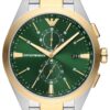 Zegarek Emporio Armani Claudio AR11511 to idealne połączenie elegancji, nowoczesności i funkcjonalności. Zaprojektowany z myślą o mężczyźnie, który ceni styl i precyzję, przyciąga uwagę swoim wyrafinowanym wyglądem i dopracowanymi detalami. Koperta o średnicy 42 mm wykonana ze stali szlachetnej w kolorze srebrnym nadaje mu charakteru i męskiej siły, a zielona tarcza o promienistym wykończeniu typu sunray subtelnie zmienia odcień w zależności od kąta padania światła, tworząc efekt głębi i elegancji. Na tarczy umieszczono subtarcze chronografu oraz datownik, które nie tylko dodają zegarkowi sportowego akcentu, ale także zwiększają jego funkcjonalność. Wskazówki i indeksy pokryte warstwą luminescencyjną zapewniają czytelność w każdych warunkach. Sercem zegarka jest niezawodny mechanizm kwarcowy chronograf, który gwarantuje precyzyjne odmierzanie czasu bez potrzeby nakręcania. Całość chroni trwałe szkło mineralne o podwyższonej odporności na zarysowania, a wodoszczelność na poziomie 5 ATM pozwala na bezpieczne użytkowanie zegarka na co dzień – podczas mycia rąk, w deszczu czy lekkiego kontaktu z wodą. Stalowa bransoleta w kolorze srebrno złotym idealnie dopełnia projekt, zapewniając wygodę i nowoczesny wygląd, a zapięcie typu motylkowego dodaje elegancji i ułatwia zakładanie. Emporio Armani Claudio AR11511 to zegarek dla mężczyzny, który pragnie podkreślić swój styl, pewność siebie i zamiłowanie do klasy premium w każdym detalu.