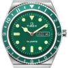 Zielona tarcza zegarka została wykończona w stylu „sunburst”, który pięknie odbija światło, nadając głębi kolorowi. Wyposażona jest w wyraźne, luminescencyjne indeksy i wskazówki, zapewniające doskonałą czytelność nawet w ciemności. Zamiast cyfr zastosowano geometryczne markery – koła i prostokąty – które przywołują stylistykę nurkowych modeli sprzed dekad.